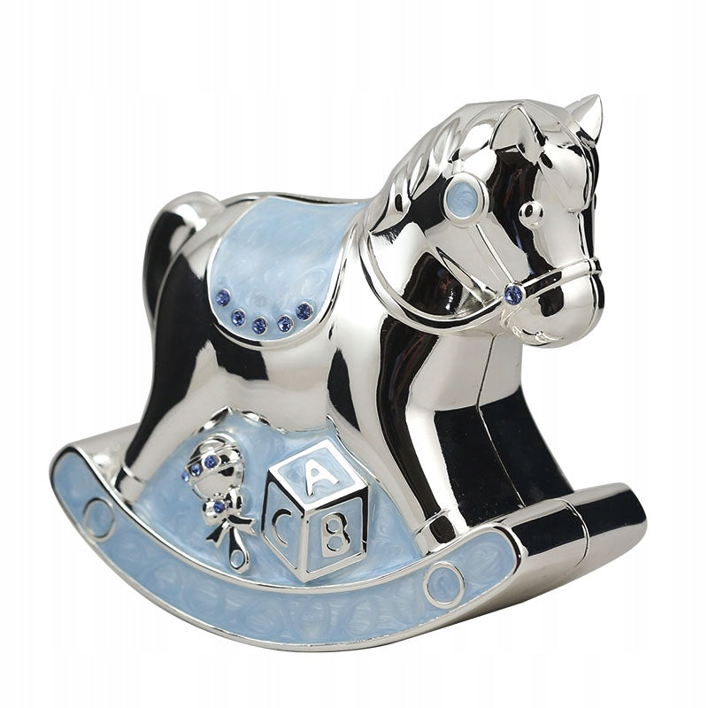 Pușculița căluț din alamă albastru, 12x12x4 cm, adaugă un strop de culoare și veselie decorului interior.