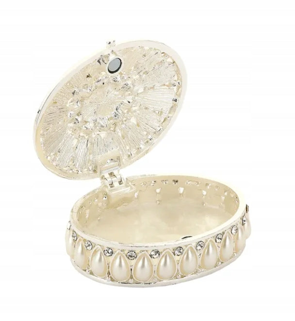 Cutie bijuterii elegantă din alamă, decorată cu pietre strălucitoare, perfectă pentru inele, cercei sau brățări. Designul compact și finisajul metalic o fac ideală pentru birou, noptieră sau colecție personală. Este și un cadou rafinat pentru pasionații de bijuterii și obiecte decorative elegante.