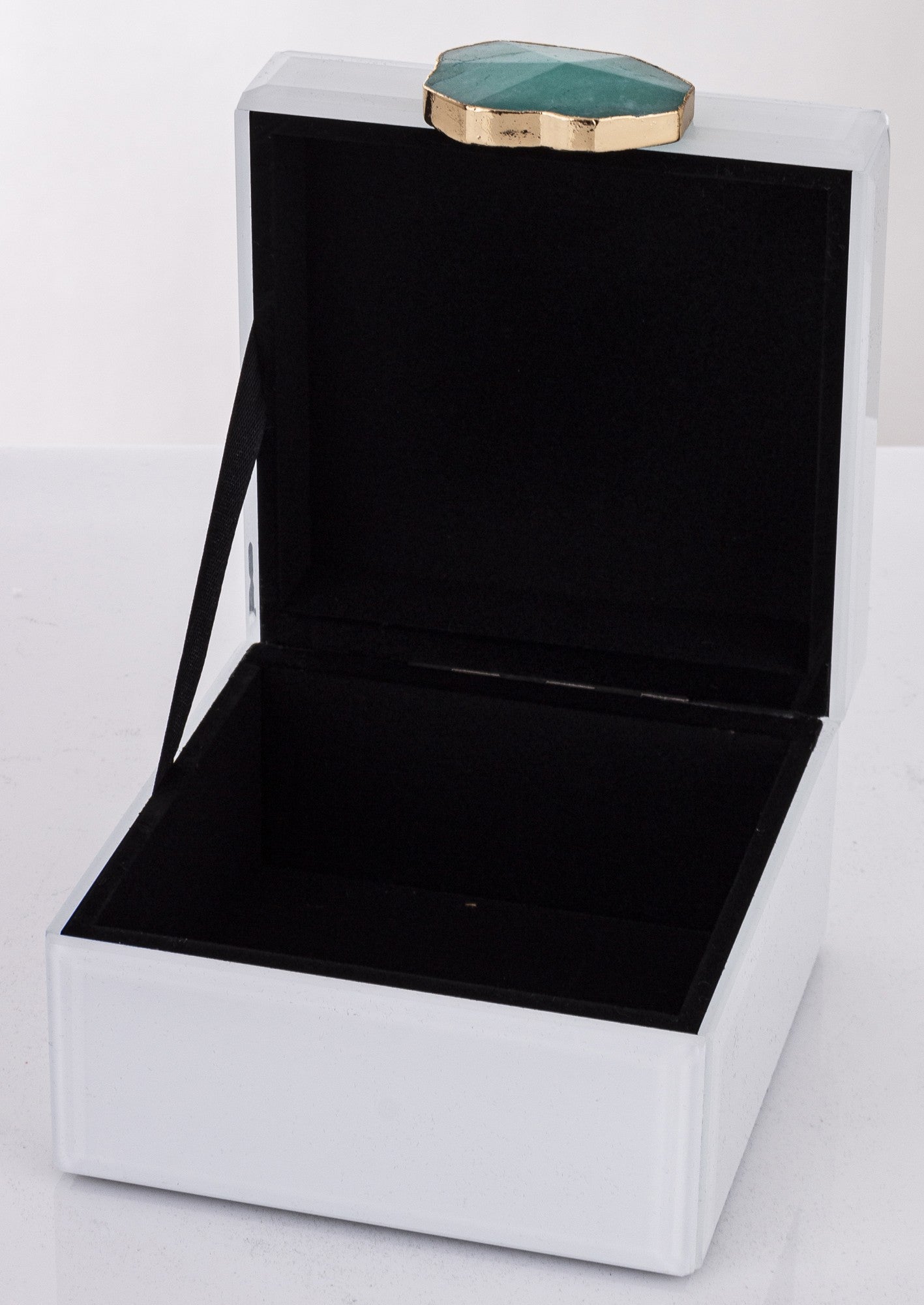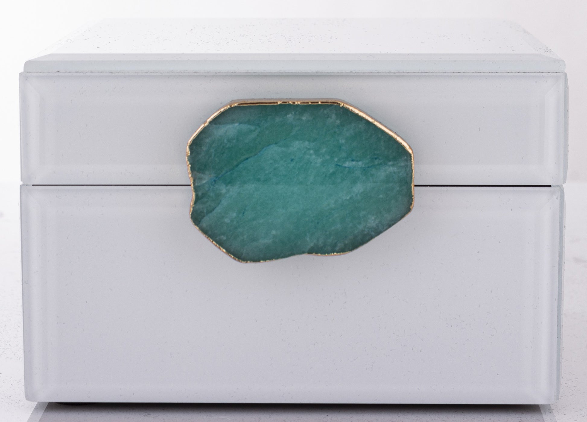 Cutie de bijuterii din sticlă albă cu piatră turcoaz, mică și elegantă, ideală pentru cadouri și organizarea bijuteriilor. Livrare gratuită pentru comenzi peste 350 lei.