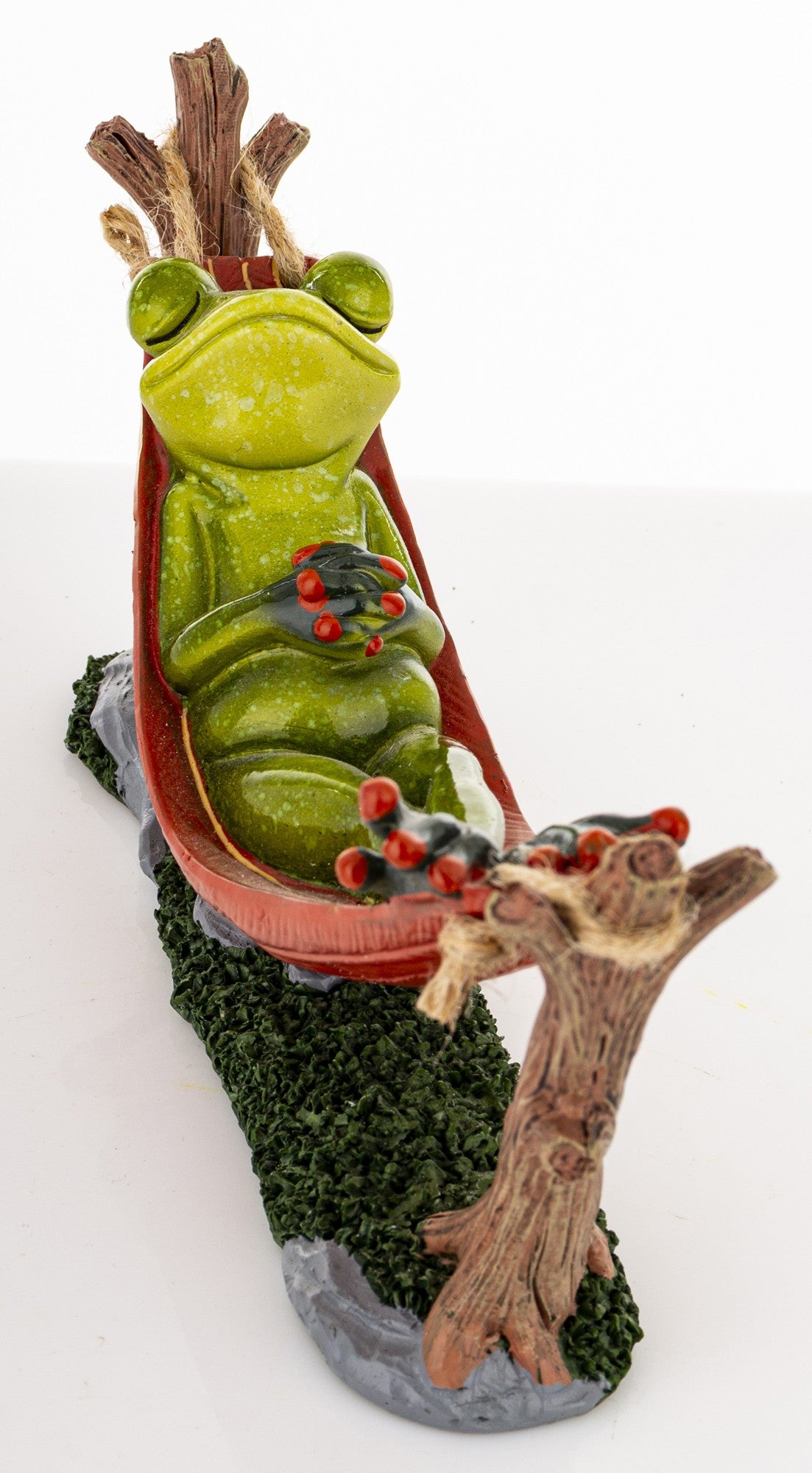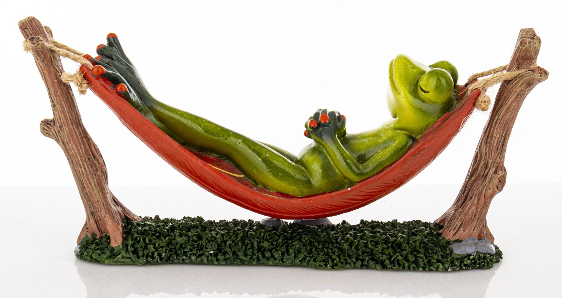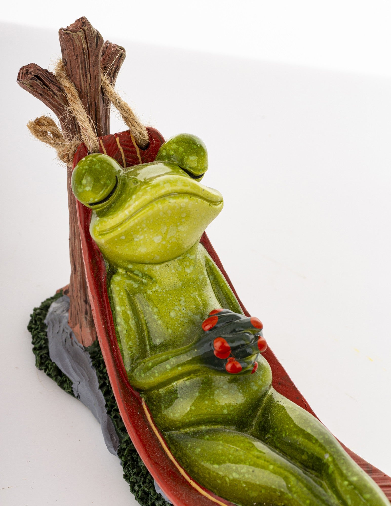 Figurină relaxantă din rășină cu broască în hamac, perfectă pentru a adăuga un aer jucăuș și vesel în decorul casei sau ca dar haios. Livrare gratuită peste 350 lei – mentha