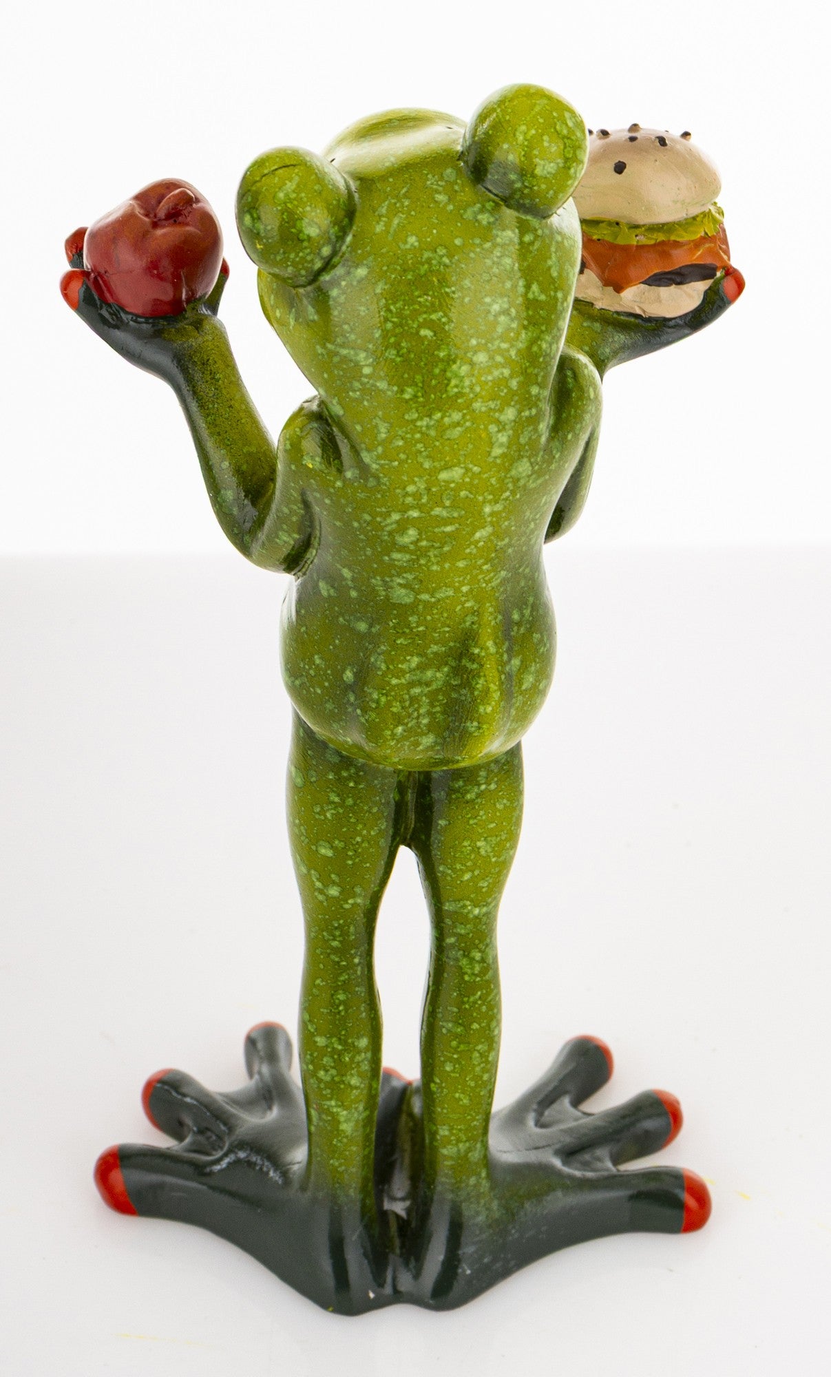 Figurină veselă din rășină cu broască ce ține mâncare fast food, un ornament jucăuș și original pentru decor interior sau cadou haios. Transport gratuit la comenzi peste 350 lei – mentha