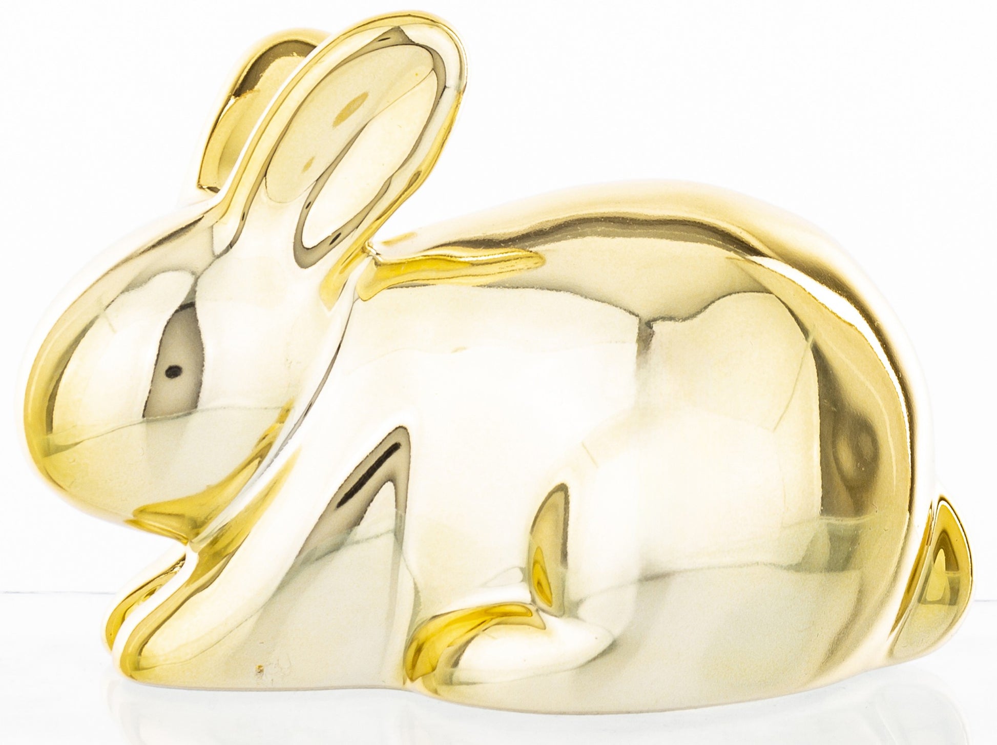 Iepure ceramic auriu mic, fin și decorativ, ideal pentru accesorii de sezon sau cadouri mici, elegante. Livrare gratuită pentru comenzi peste 350 lei.