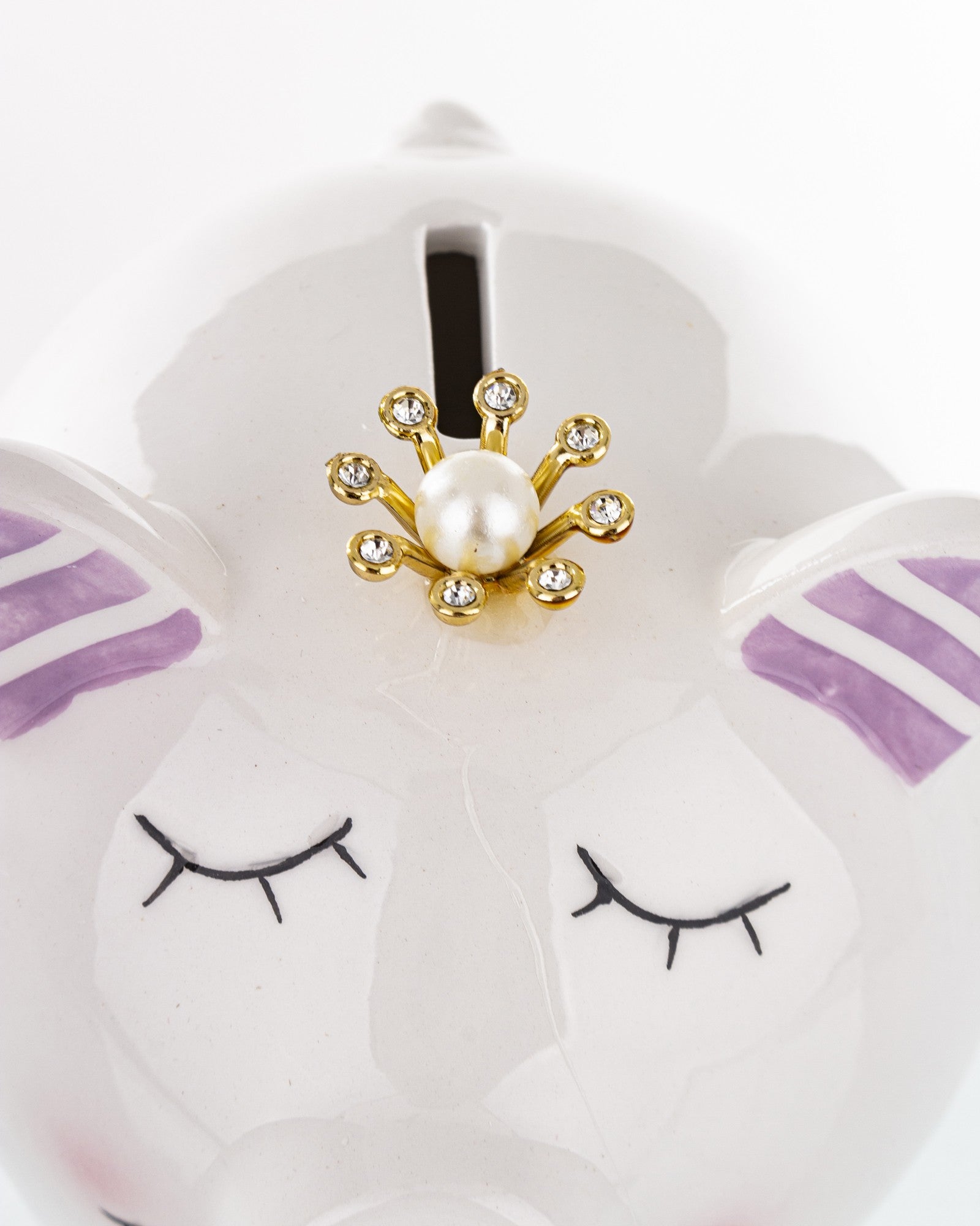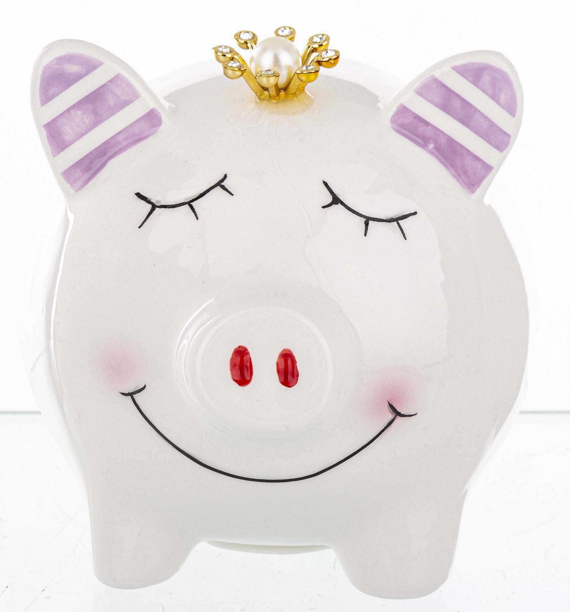 Pușculiță ceramică în formă de porcușor cu coroană, drăguță și practică pentru economisire sau ca obiect decorativ deosebit. Livrare gratuită pentru comenzi peste 350 lei.