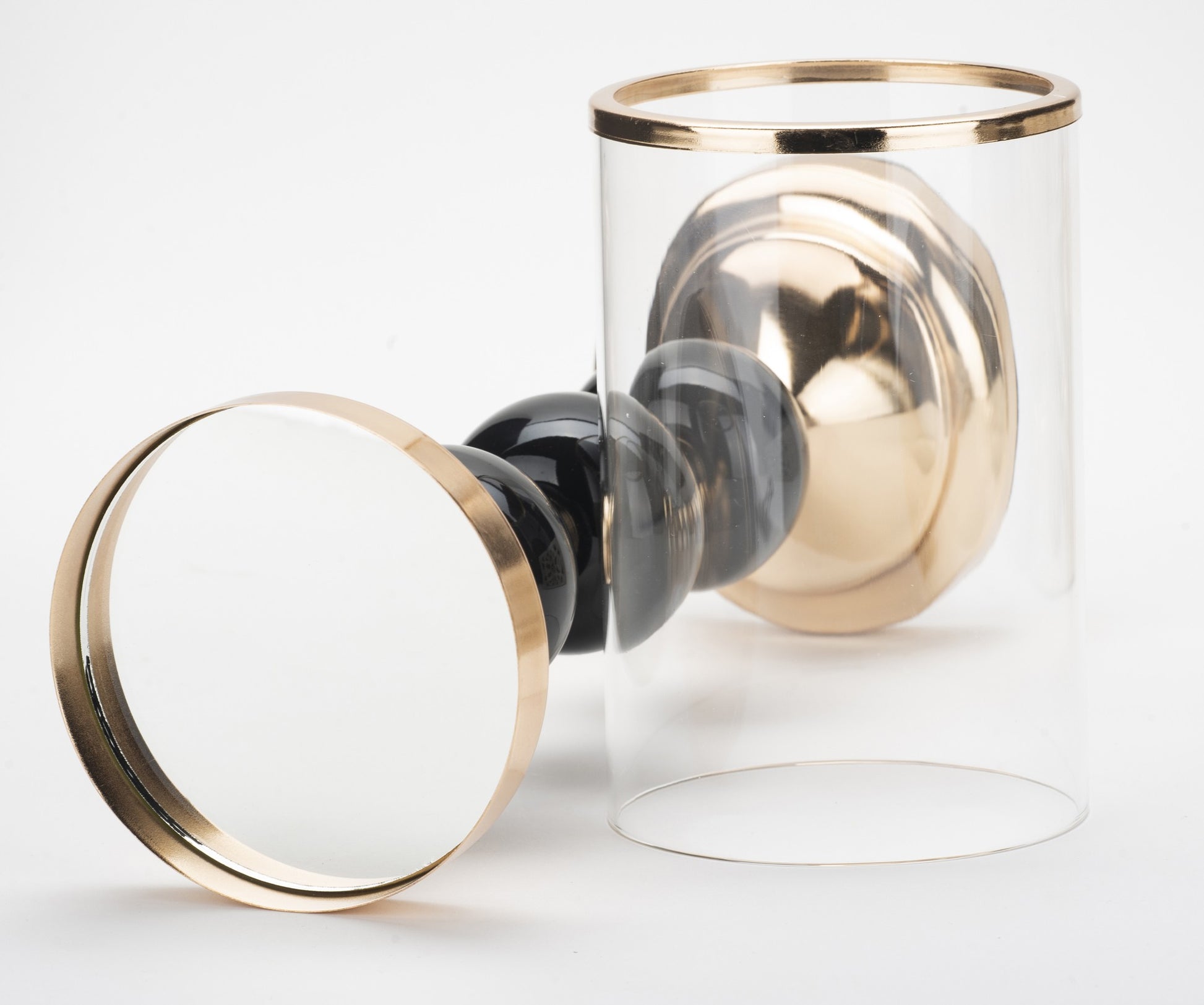 Sfeșnic auriu cu trei bile negre, 44x11x11 cm, realizat din metal și sticlă. O piesă decorativă elegantă și modernă, ideală pentru a completa masa festivă sau decorul livingului, aducând un aer sofisticat.
