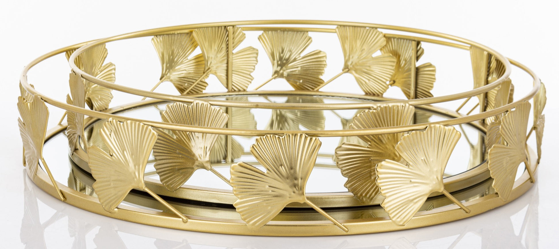 Tavă ginko aurie mare, 38x38x7 cm, din metal și sticlă cu oglindă, design impunător și elegant. Ideală ca piesă centrală decorativă.